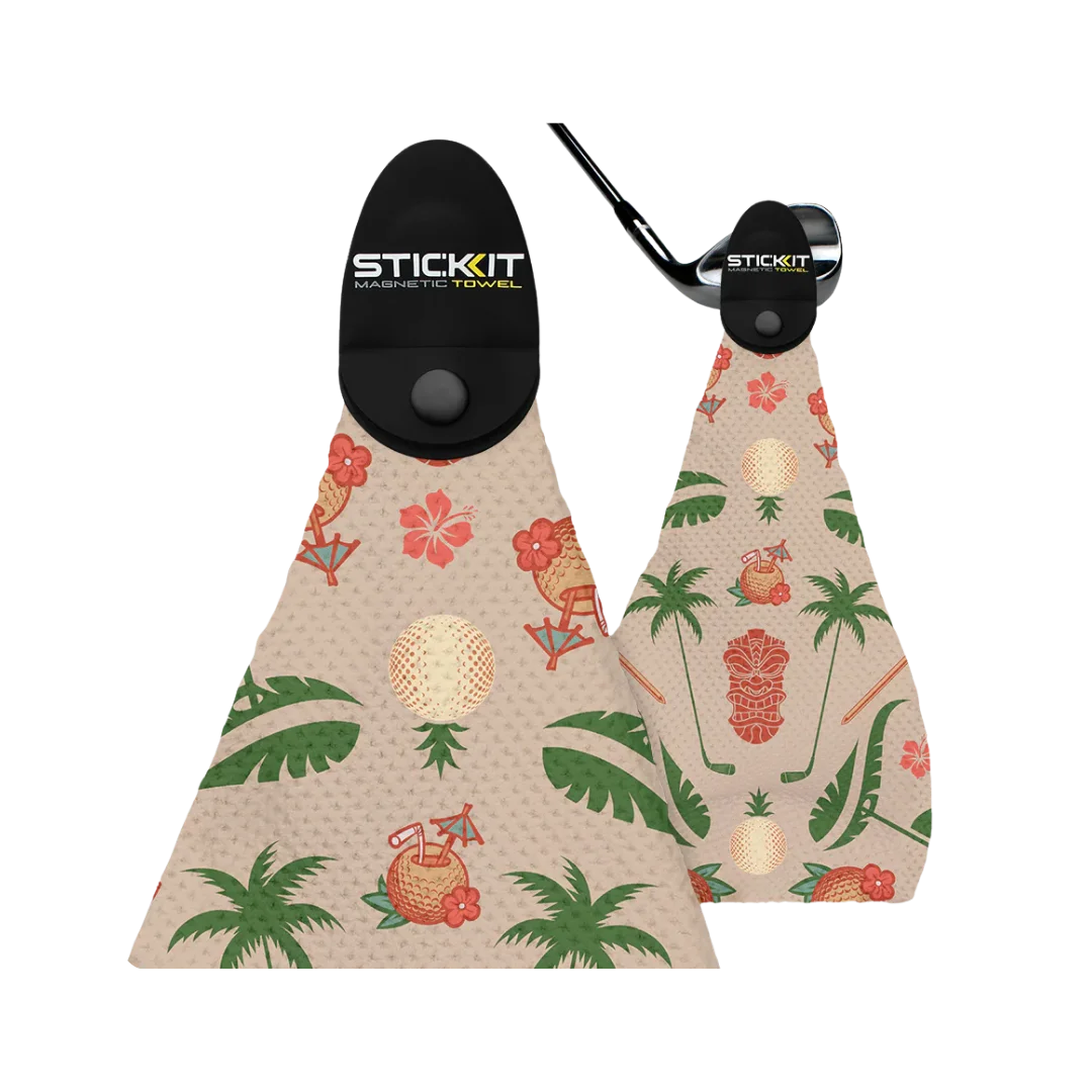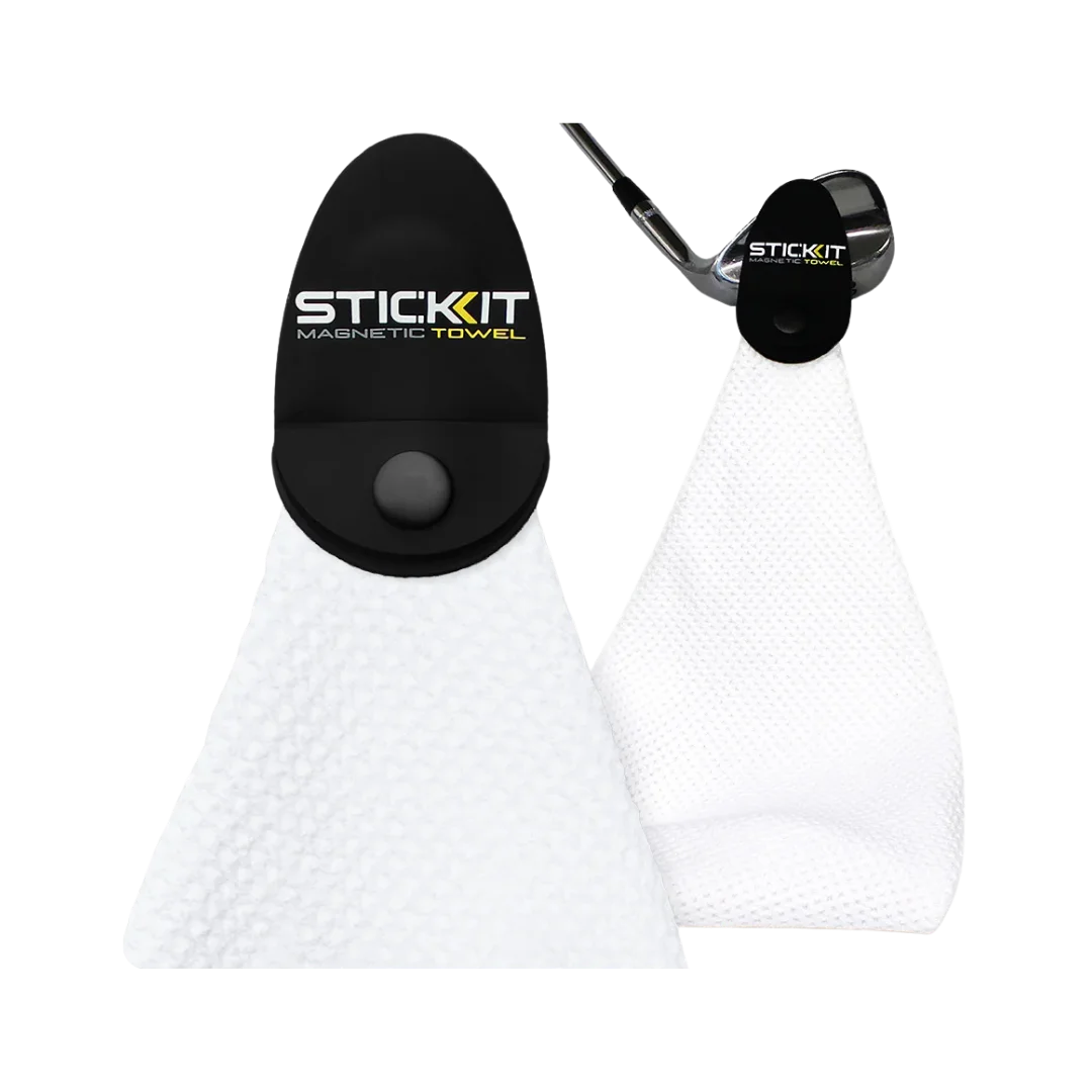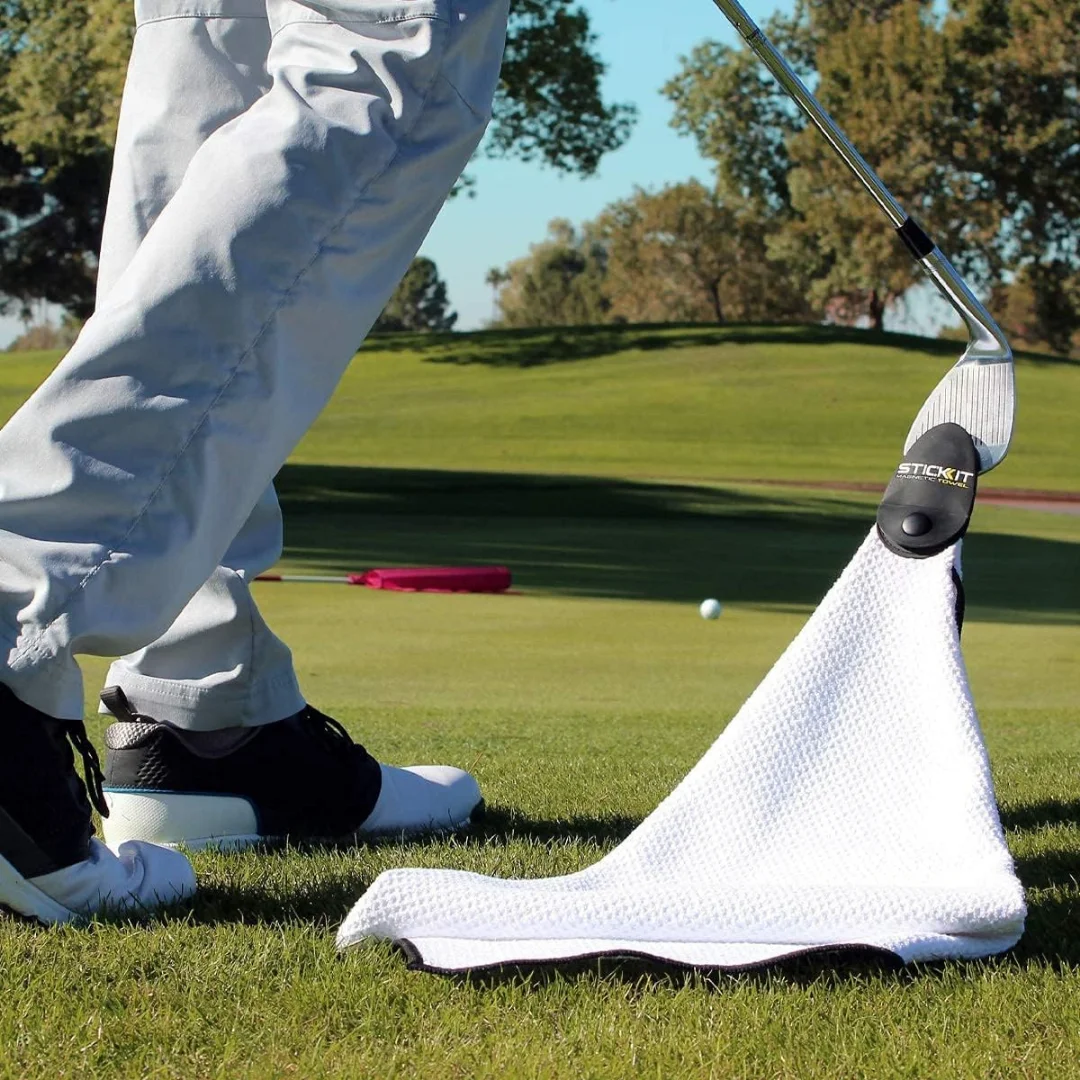 This STICKIT Towel is a premium microfiber golf towel built around an industrial strength magnet that snaps and holds to your cart, irons, wedges, putters, and bag so it is always within reach when you need it. The waffle weave pattern does real cleaning work on grooves, pulling out dirt and debris faster than a flat towel, and the top tier microfiber construction absorbs water quickly and dries fast after the round. The silicone patch protects the magnet area from moisture, and when it is time to wash, the magnetic patch removes cleanly via snap button so the microfiber goes safely through the machine without damaging it. The putter assist grip plug (optional) makes your putter grip magnetic so the towel snaps right to the end of the grip for instant access around the green. Available in three sizes and over 20 designs, there is a version for every bag setup and every golfer.