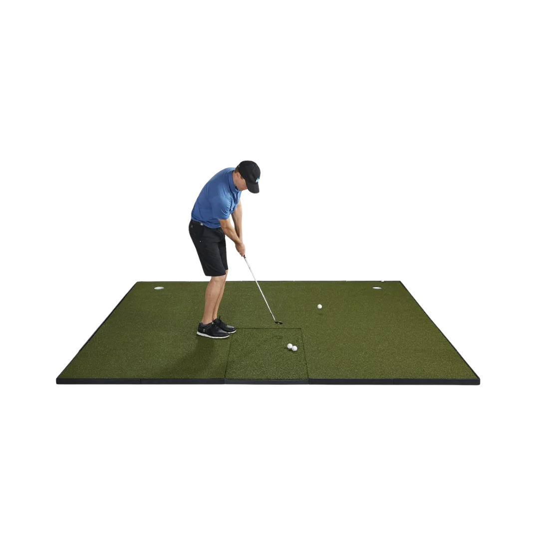 The Fiberbuilt Player Preferred Series Hitting and Putting Combo Mat from Carl's Place gives better players a full game practice surface that combines a realistic hitting strip with a premium putting green. The 10 ft by 10 ft (or 12x10) by 2 inch mat uses Pure Impact Turf that simulates real fairway grass, launch monitor tested for accuracy, and absorbs 94.7% of clubhead vibration so you strike without joint pain or hesitation. The putting turf runs at 9 on the stimpmeter with true roll and chip check, backed by embossed rubber to stay flat. Tool-free assembly works indoors or outdoors on firm surfaces. Buy this if you want pro level practice in your garage or backyard without mat wear or bounce issues.